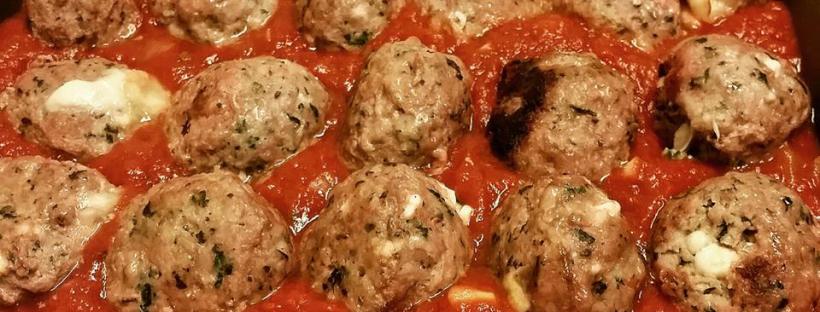 Form your meatballs by placing a small scoop into the palm of your hand flat, add cube of mozzarella cheese and form the ball to cover the cheese. You should be able to make between 12-16 meatballs depending how large you want them to be. Place meatballs on greased dish and bake for 35 mins turning each one half way.